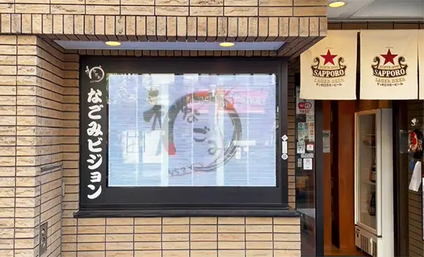 飲食店で導入されたデザインの例として、フレームに店舗名を入れたウィンドウタイプのデジタルサイネージがあります。