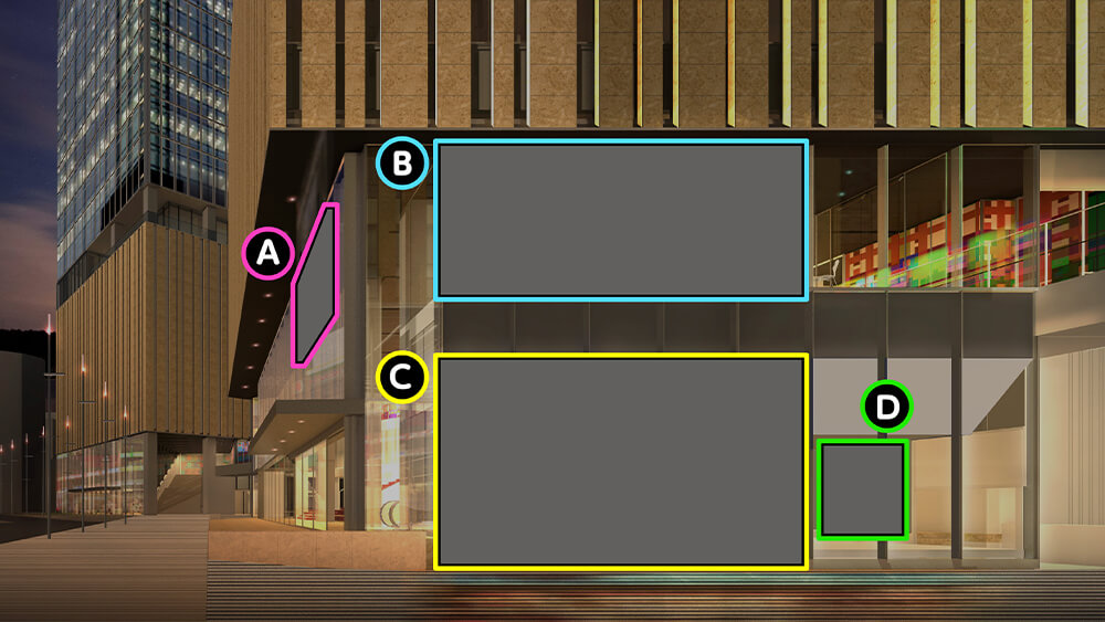 Aタイプ:正面入口上部(6.6ミリピッチ、横5.6メートル×縦3.2メートル)、Bタイプ:2F LEDウォール(8ミリピッチ、横8.64メートル×縦2.4メートル)、Cタイプ:1F LEDウォール(6ミリピッチ、横8.64メートル×縦4.32メートル)の、日本最大級の合計3面の大型LEDビジョンは、高い訴求力で情報を発信します。