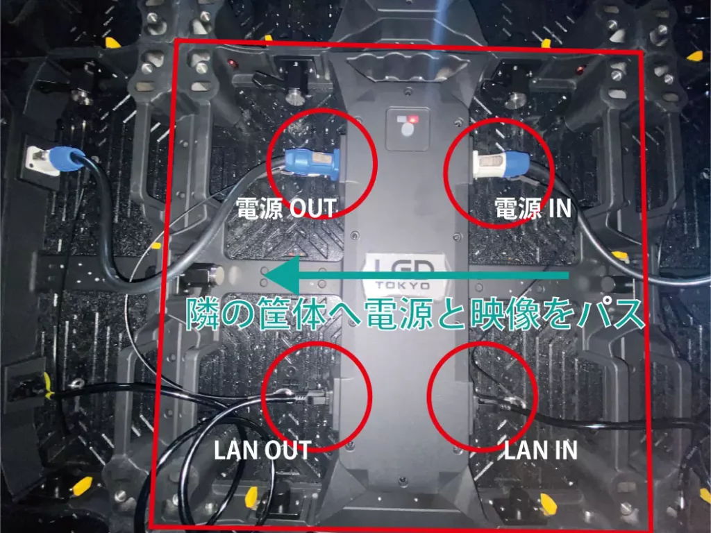 LEDビジョンが着々と設置されている裏側では、電源を各筐体に供給する為に、筐体同士を電源のケーブルでつないでいきます。各筐体には電源のinとoutが存在していて、隣の筐体から電源を受け取り、その電源をまた隣の筐体に受け渡すことで全筐体に電源を供給することができます。ですから、途中でケーブルが抜けてしまったり、ケーブルのin、outが間違っていると正しく電源が供給されないので、正確に映像を映し出すことができません。また、USBやパソコンなどに入っている映像データは映像出力装置を経由してLEDビジョンに映像を渡します。その際必要になるのがLANケーブルです。電源のケーブル同様に映像出力装置からLANケーブルを経由して各筐体に映像を渡していきます。