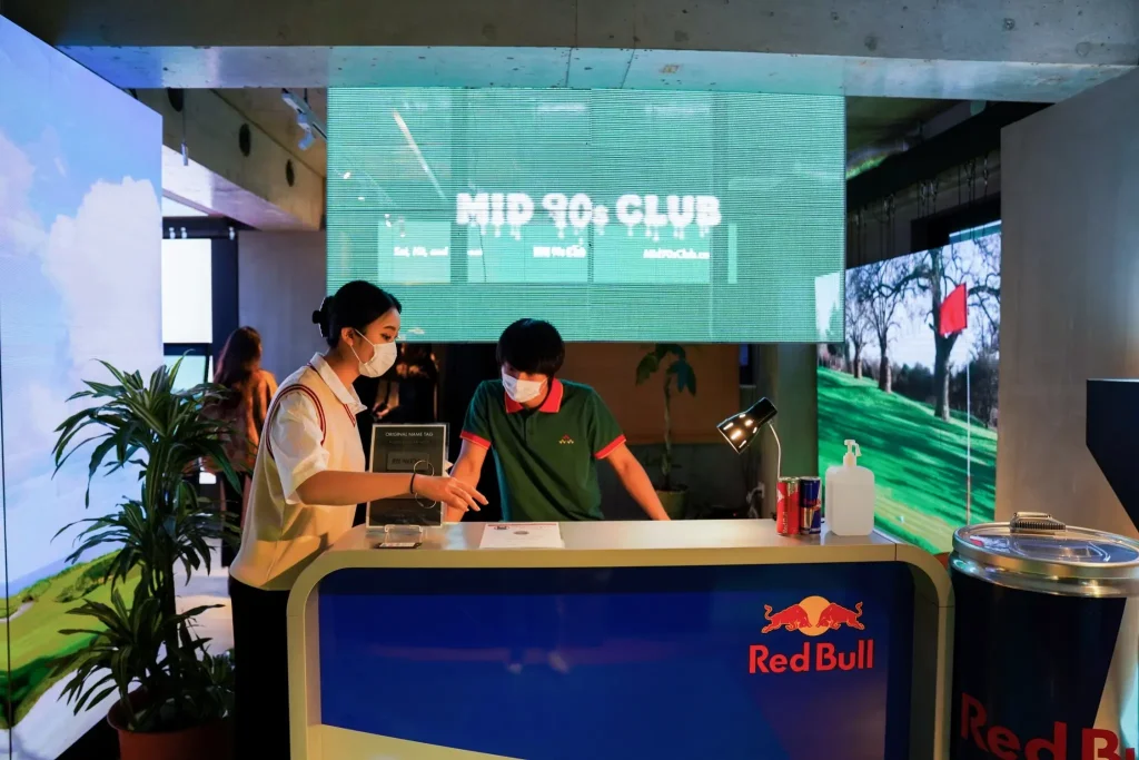 「 mid 90s Club」初めてのPOP UP・受注会は、去年の10月にLED TOKYOのショールームで行いました。その際のコンセプトが「街中にいるけど、ゴルフ場にいる感覚を味わう」で、ショールーム内の全てのLEDビジョンを使用して、5分ごとにゴルフ場の映像から街中の映像に切り替えたり、受注会の紙をスコアカードに変えたりして場の雰囲気を演出したりと、映像の切り替えることで場の雰囲気がガラッと変わりました。