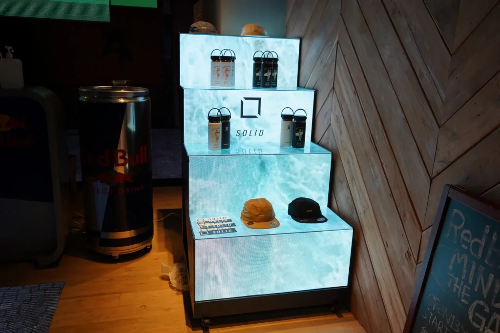 金丸:さっきの「チッピング」のブースもそうなんですけど、壁一面にある大きな画面を活用して、アパレルの着用イメージ映像を流すことで、お客さんが映像から「この服カワイイ」と印象を受けてその場に展示されてる洋服を選んだり、直接洋服をみてから映像で着用イメージが湧くのもLEDビジョンならではだと思いました。