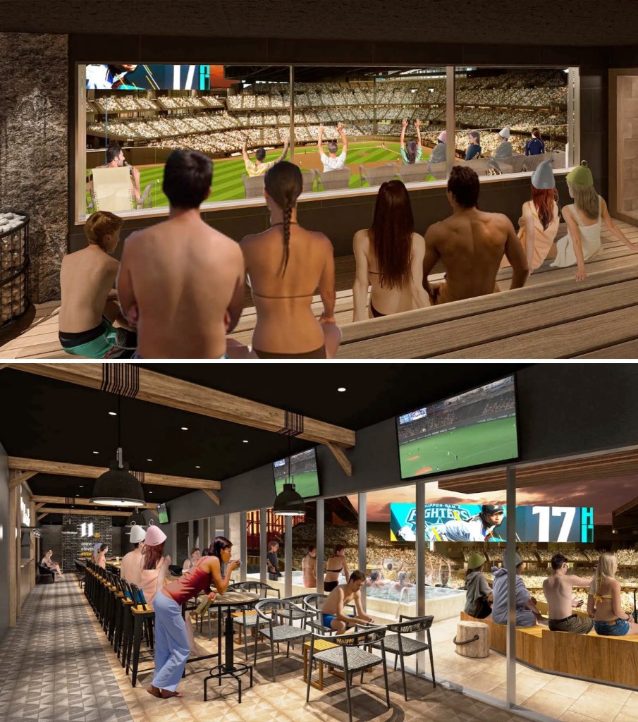 演出以外にも、様々な仕掛けを予定しており、レフト側の5階層ビルには、なんと4階が、温浴・サウナ施設、5階は、宿泊施設を常設し、どちらも試合を観戦しながら利用できるとのこと。