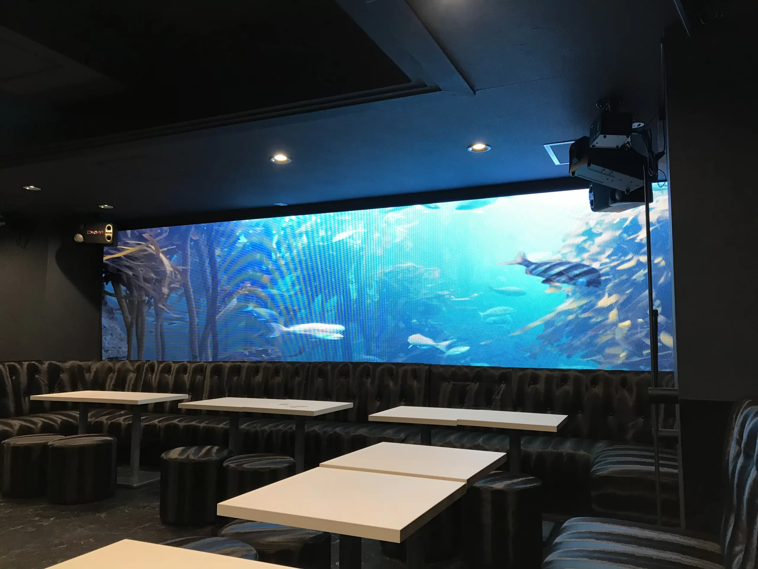 東京都新宿区にある「No.9 by ACQUA」の移転リニューアルに合わせてLEDビジョンを導入しました。天井に複数のLEDビジョンと円形のLEDビジョンを導入。正方形のLEDビジョンが散りばめられた天井は他では見たことのない空間を演出します。