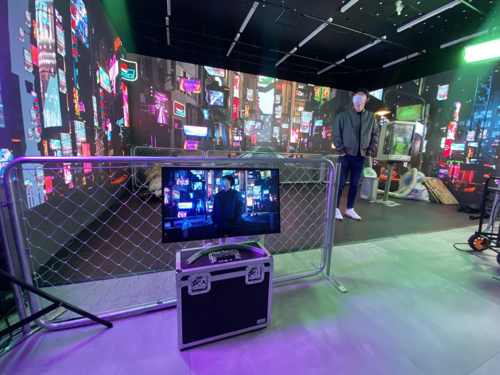また、カメラの動きと背景映像をカメラトラッキングシステムを使い、リアルタイムで連動させることで、カメラの動きに合わせて映像が変動し、従来にはない、よりリアルな映像を撮影することができます。