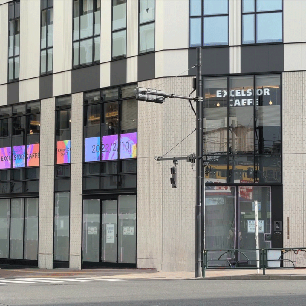 エクセルシオールカフェ高田馬場駅前店の窓面にウィンドウビジョンを導入し、窓面での宣伝活動を可能にしました! ウィンドウビジョンを使用して窓面を有効活用してみてはいかがでしょうか?