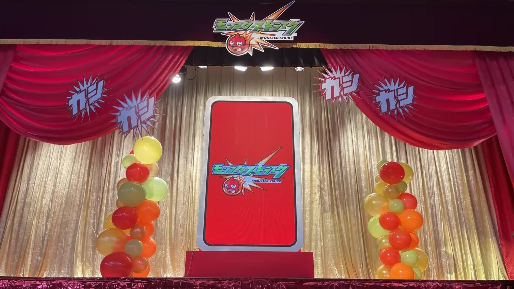 スマホアプリということで、画面の比率をスマートフォン同様の縦型にし、LEDビジョン周りを装飾し、大きなスマートフォン見立てた演出を行いました。