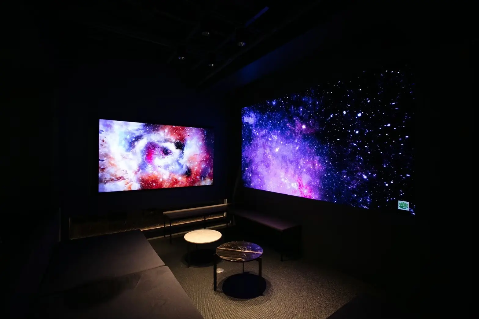 ラウンジに設置されたLEDビジョンは店舗が演出したい高級感を崩さずに、シームレスで没入感のある大画面を実現することができます。