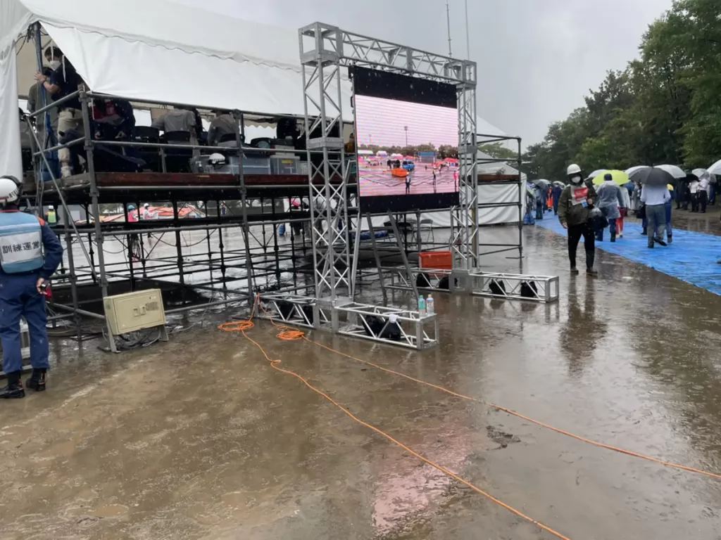 埼玉県北本総合公園で行われた第43回九都県市合同防災訓練・令和4年度埼玉県北本市総合防災訓練(防災フェス)にLEDビジョンを導入しました。屋外用のLEDビジョンは防塵・防水性能を備えているため雨天でも問題なくご利用いただけます。