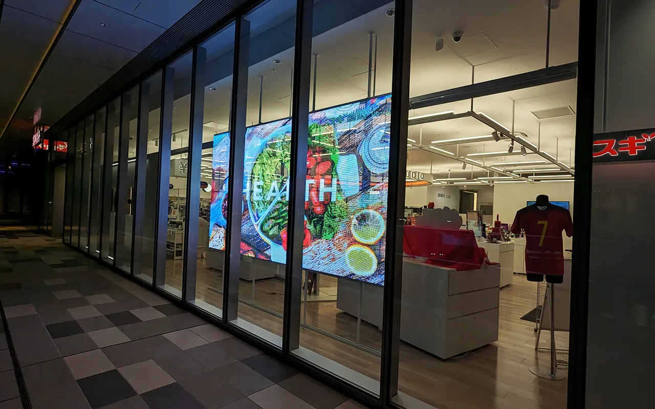 ウィンドウビジョンはブラインドタイプの透過型LEDビジョンとなっているため、店内には外光を取り入れながら、店外からでも店舗を確認することができる製品となっています。またウィンドウビジョンは薄型かつ軽量な為、店内外に圧迫感を感じさせません。