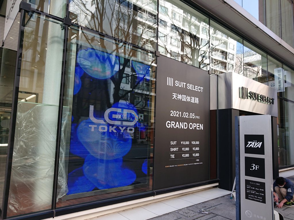 2021年2月5日、福岡県天神地区の国体道路沿いにオープンした『SUIT SELECT 天神』にLEDビジョンを導入しました。アートディレクター佐藤可士和氏監修の元『リアルスーツ』をコンセプトに全国展開している、株式会社コナカの運営するスーツセレクトです。