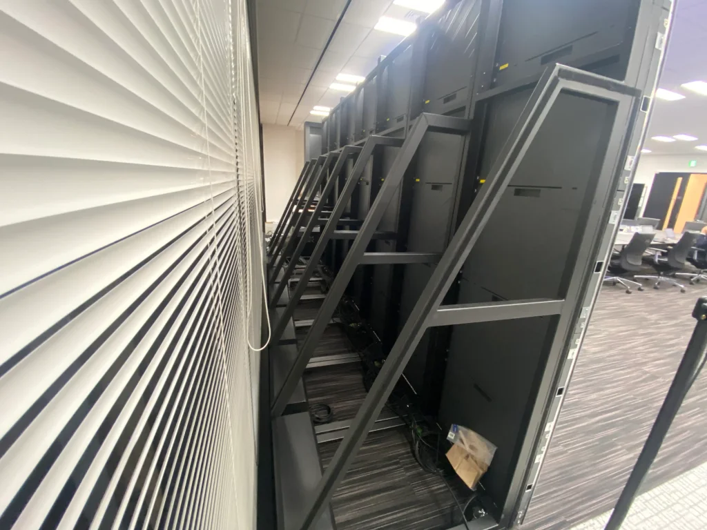 バックス株式会社の東京オフィスに可動式のLEDビジョンを導入しました。今回は幅4,480mmのビジョンを、幅640mmに7分割し、ビジョンの足元にキャスターを設置した「可動式のLEDビジョン」となっています。 未使用時には移動したり、使用したいサイズのみ使用することもできるので、臨機応変な使い方が可能なLEDビジョンです。